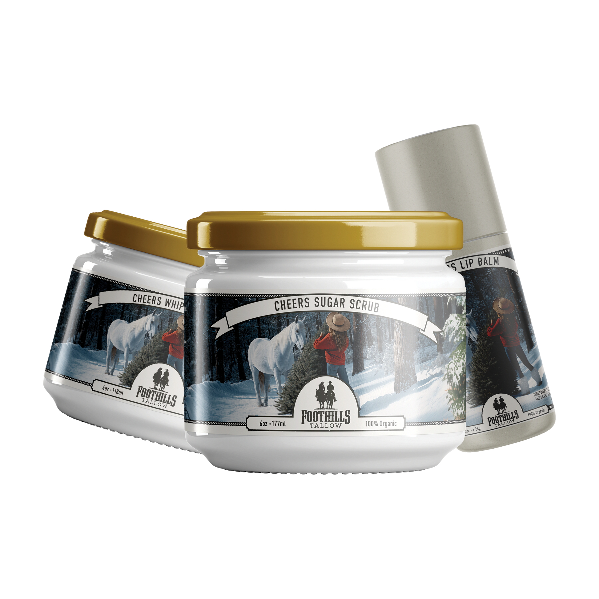 Celebrate the season with the Cheers Christmas Tallow Bundle, a full-sized trio of Foothills Tallow’s bestselling Cheers products. This festive set delivers head-to-toe hydration, soft glowing skin, and a juicy, effervescent scent that feels like popping a bottle of something special.